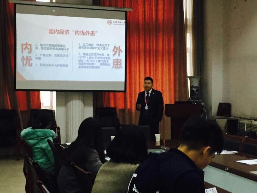 王锐总经理从中国新时期保险业的发展角度入手,生动形象地介绍了当前保险行业未来的发展前期,随着社会资本的涌入、互联网+的冲击以及金融业银行的大批量涌入,各保险公司间的竞争强度也日益激烈,但是这也预示着我国保险行业依旧面临着巨大的商机。王锐强调,当前影响保险行业发展的主要因素有经济发展水平、政府规制以及社会保障。我国未来的保险发展对策应该是有针对性地拓宽保险业的服务对象与服务范围,改变单一的保险形式,与此同时,加强监管力度并防范风险,最终通过提升服务品质,强化企业形象,从而才能保持更加长久的发展。他也提到,中国的保险市场潜力巨大,人民的保险意识逐渐增强,保险行业日益规范,保险保障更加健全,中国未来的保险业发展将更加的开放。最后,王总从公司组成架构、公司文化、公司发展等对富德人寿有限公司作了简要的介绍,特别是公司目前正处于发展期,需要大量的人才,也欢迎广大毕业生能够投身保险行业。