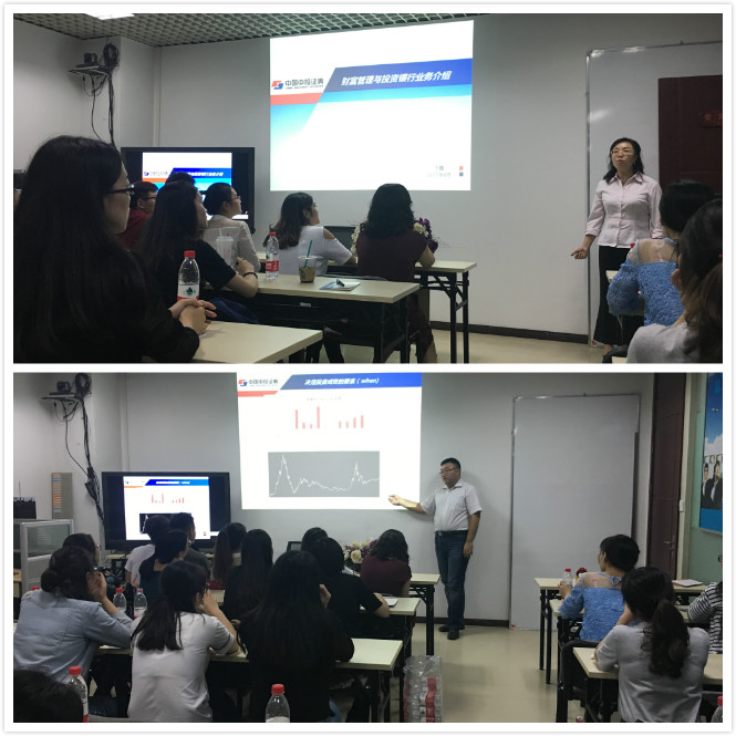 下午两点,实习队伍来到中投证券西安营业部参观学习,营业部郭总对中国中投证券的前身、发展做了简要介绍,随后客户总监于霏为大家带来了一场职业盛宴:关于财富管理与投资银行业,围绕决定成败三大要素——when、where、how,即什么时候投资,去哪投资、如何投资进行了全面的解读与讲解。报告中,围绕当前国民投资需求、投资理念、不同时期人民币币值变化的原因、上市公司的入市流程、金融机构利润来源等方面进行了全面的案例分析。报告结束后,于先生还对员工以后工作的选择提出了针对性建议,并热心的对大家提出的问题——如何进行短线长线的投资、飞单风险等进行了解答。