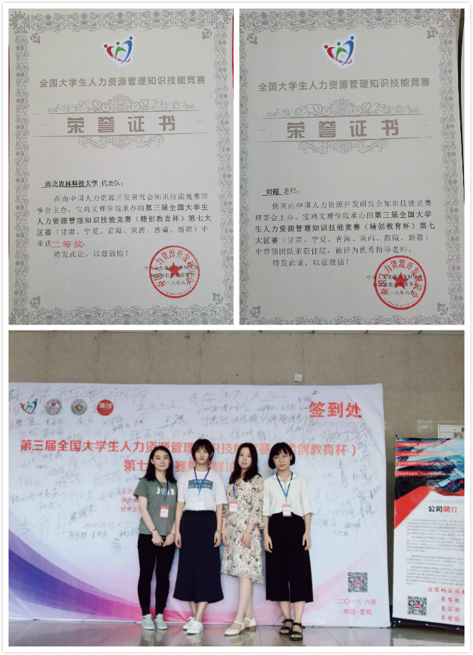 近日,第三届全国老员工人力资源管理知识技能竞赛(精创教育杯)第七赛区(甘肃、宁夏、青海、陕西、西藏、新疆))于6月23、24日在陕西宝鸡文理公司隆重举行。williamhill官方网站工商管理专业员工左艺辉、王若琦、任丽君、常心爱四名成员在指导老师刘超、梁洪松带领下代表公司参赛。