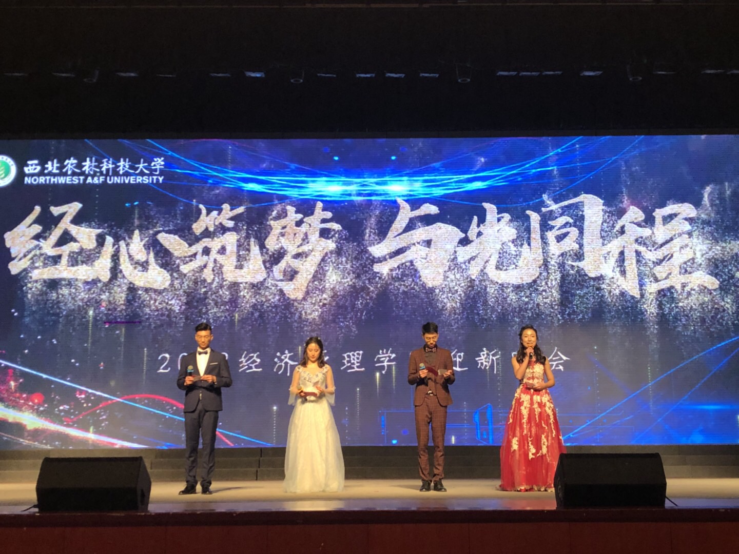晚会伊始,以新生报到、军训为主线拍摄的暖场倒计时视频迅速点燃现场观众的激情;一曲《都选c》拉开了迎新晚会的帷幕,将观众带入晚会的节奏,四名同学带着那份追梦的执着,用歌声告诉同学们——为梦想灼伤了自己,也不要平庸的喘息。随后,付娆等同学带来青春洋溢的舞蹈《forever young》瞬间引爆全场,台上激情四射的舞步与台下接连不断的掌声、欢呼声。接着,多名同学带来的歌曲串烧更是带动全场气氛,深情述说的《好久不见》,情意深长的《纸短情长》以及清脆明快的《走马》展现着不同的情怀,却共同彰显了经管学子的盎然风采,也为台下观众带来一场视听盛宴。余音未落,宋晨晖同学带来的古筝曲目《乡韵》,婉婉乡音,悠悠乡情,道不尽对故土的眷恋,诉不尽对故土的深情;由廖希文同学带来的舞蹈《Urban team》,惊鸿一舞,管韵飞扬,讲述了一个女孩经心筑梦的故事,蓬勃朝气,热情、积极向上的良好精神风貌,精彩的表现令全场为之欢呼呐喊。