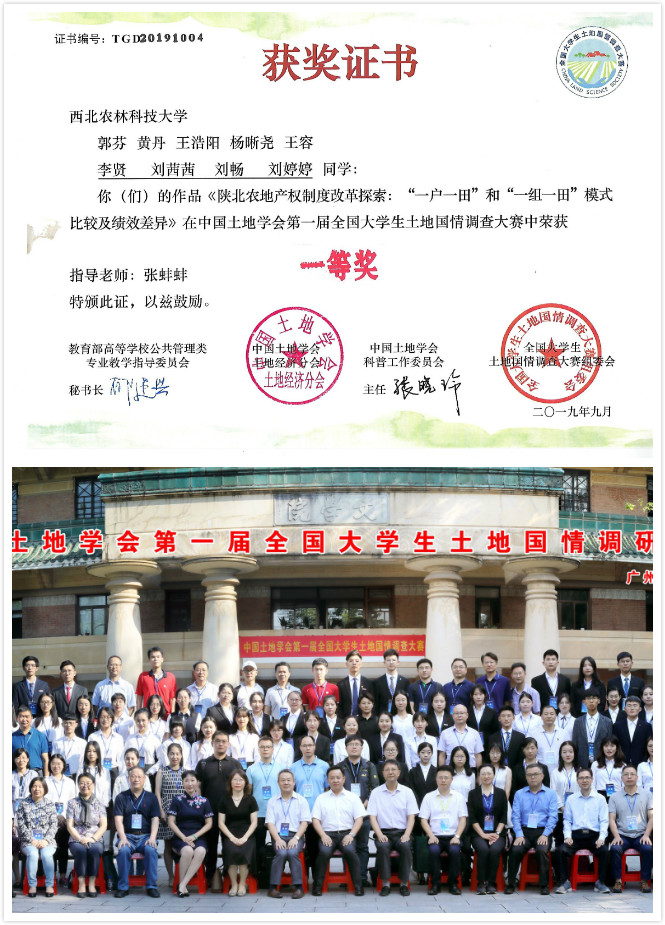公司土地资源管理专业2017级本科生郭芬、黄丹等领衔的行者团队在公司青年教师张蚌蚌博士指导下,以“陕北农地产权制度改革探索:“一户一田”和“一组一田”模式比较及绩效差异”参赛作品入围决赛并荣获一等奖(奖金5000元)。该奖项的获得,有效锻炼了本科生的探索和研究能力,显著促进本科生加强专业课程学习并学以致用。队长郭芬感言,从确定题目、到问卷设计、到报告撰写,一次次的修改和制作PPT,多次的演练,成绩的取的离不开指导教师和陈海滨老师的悉心指导,感谢公司提供的平台。指导老师张蚌蚌说,“能够与东道主华南理工大学代表队,南京大学和浙江大学代表队共同获得一等奖,提升了公司在同行中的声誉;体现了本科生的卓越创新能力,培养了员工的爱国和恋土情怀,激发了员工探索认知祖国土地的激情”。