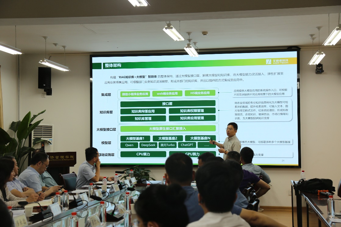 公司2015届生命科学公司员工、杭州艾格睿科技有限公司总经理高霈介绍了公司技术情况,讲解了大模型的技术路线和研发计划,着重介绍了多个大模型赋能农业的具体应用场景:如智能物联网平台、智能空间大数据平台、水肥排灌智能调度、植保无人机作业、AI农技咨询、农业行情判断以及智能农业生产管理,并结合实际案例展示技术落地成效。此外,高霈还围绕大模型后续迭代升级和场景推广应用,系统性提出可落地的解决方案,为后续的升级开发与产业应用提供清晰路径。并现场与公司签订了联合开发“后稷农业大模型”的协议。