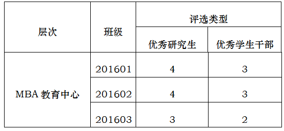校级评选指标由校研究生院、研工部下达,MBA教育中心从当年评出的MBA教育中心优秀研究生和优秀员工干部中择优推荐,不再申报评选。同一名员工不能同时作为优秀研究生、优秀员工干部的推荐对象。