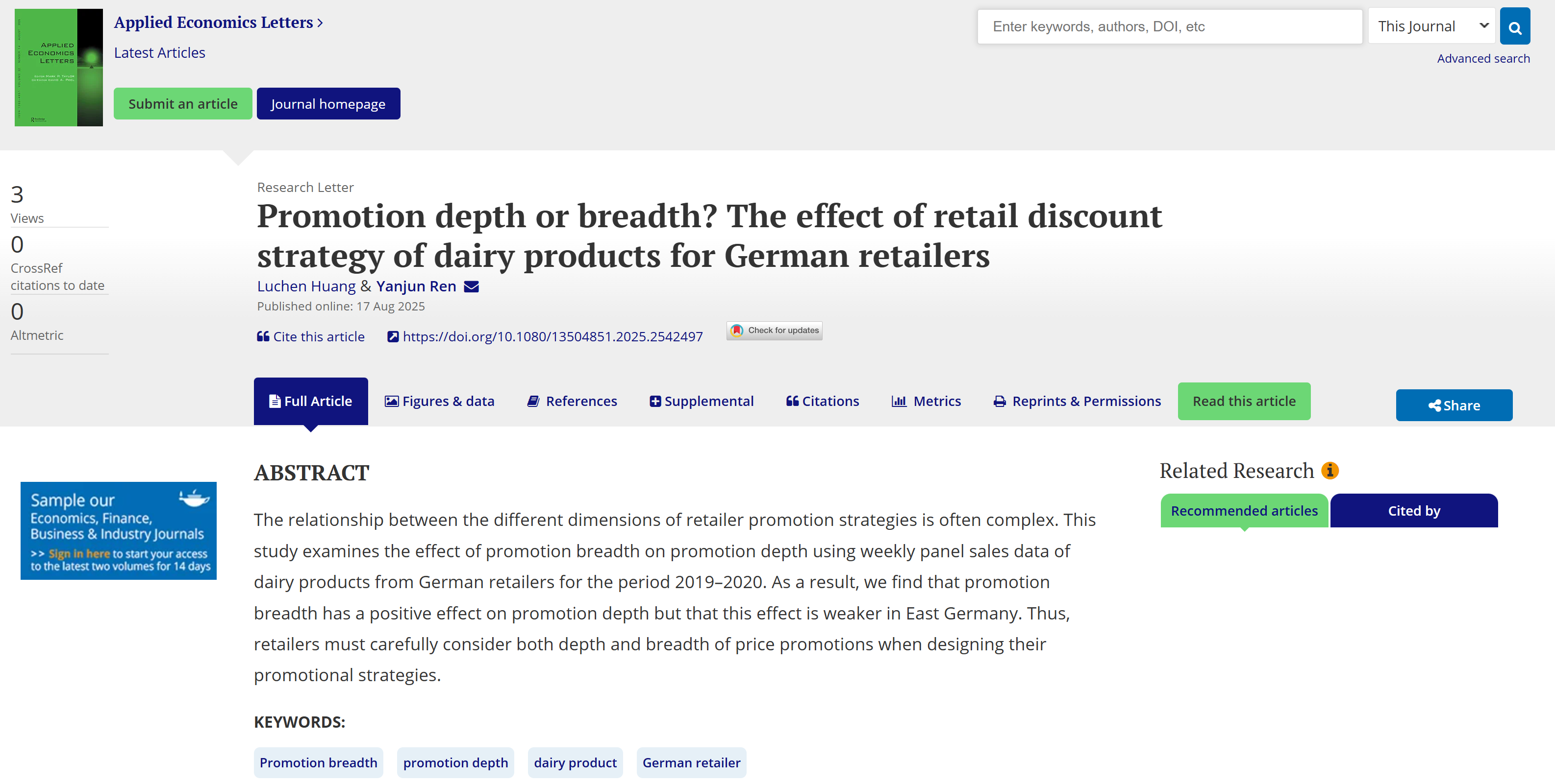 近期,williamhill官方网站任彦军教授课题组在《Applied Economics Letters发表最新研究成果,论文题目为“Promotion depth or breadth? The effect of retail discount strategy of dairy products for German retailer”。任彦军教授为论文通讯作者,黄禄臣博士生为论文第一作者。