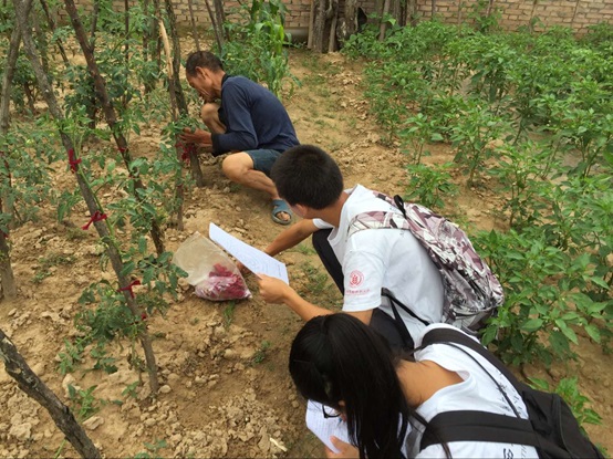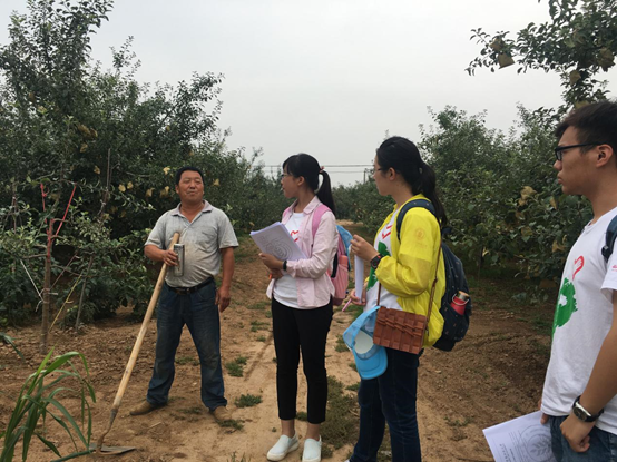 一大早队员们都早早的起床,一行人赶在村民出门劳作前来到村子,通过划分小组以求覆盖全村的的方法分头展开调研。村民们对我们的到来表示了热烈的欢迎,在表明来意后,也都积极主动地回答问卷上的问题。在采访的过程中我们发现,当地的果农将所有的土地都用来种植苹果,苹果是他们经济收入的唯一来源。一位大伯说道:“农民是靠天吃饭的,对于我们种苹果的农户来说,苹果最怕的就是冰雹,一打就全完了,一遇到冰雹那就得受损失。”