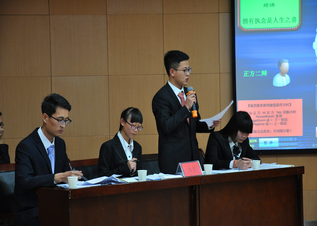本次决赛辩题为“拥有执念是人生之喜或是人生之悲”,由工管1605、1606、1607班组成的“经纬队”与经济1604、1605、1606班组成的“说的都队”进行冠军的争夺。决赛按照常规辩论赛比赛规则,在开篇立论环节,正反双方辩手慷慨陈词,援举实例发表了对执念的看法。之后的驳论环节各辩手使出浑身解数,找出破绽并以此反驳对方。双方在攻辩环节互不退让,交替发言,灵活的思维和缜密的逻辑赢得观众的阵阵掌声。自由辩论环节,更是精彩万分,参赛队员唇枪舌战,旁征博引,字字珠玑,步步紧逼,力争短时间内为自己的队伍争取机会。正反双方的四辩在最后环节做了总结陈词,总结自己的观点与看法。观众也就自己对辩题的理解向辩手提出质疑和询问。激烈的辩论在观众们的叫好声中画上了句号。
