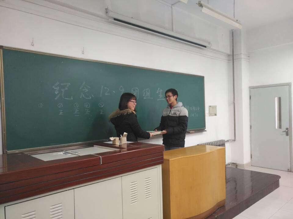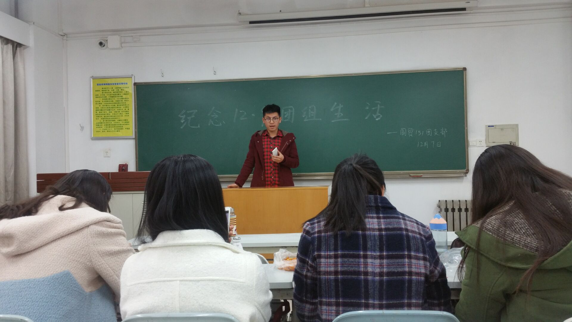 2016年12月7日上午,国贸151班在八号教学楼8223举办团组织生活,主题为“纪念12•9运动,弘扬爱国精神”。本次团组织生活由国贸151班班委共同组织开展,团支部书记郑紫彤主持,共计22名同学参加。