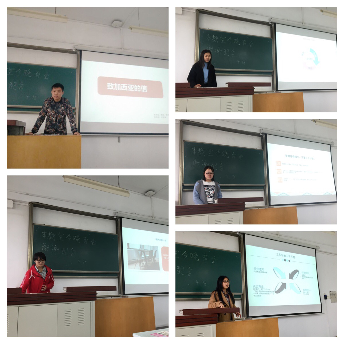 会上,肖启龙、曾赟婕、张烨华、曹雪迎和高丽同学讲述了美国作家阿尔伯特·哈伯雷的《致加西亚的信》。书中讲了一个真实的故事:美西战争期间,美国总统急需求得在古巴丛林中反抗西班牙军队的起义军首领加西亚的合作。然而,没有人确切地知道加西亚到底在哪里。有人对总统说:"或许一个名叫罗文的人有办法找到加西亚,也只有他才找得到。"于是,总统把罗文中尉找来,把致加西亚的信交给他。尽管罗文也不知道加西亚在什么地方,但他接过这封信,什么也没有说就出发了。三个星期之后,他徒步走过一个危机四伏的国家,历尽波折,凭借自身的智慧和勇气终于找到了加西亚。故事情节极其简单,但它却向人们深刻传达了这样一个理念:对工作的忠诚与信念。