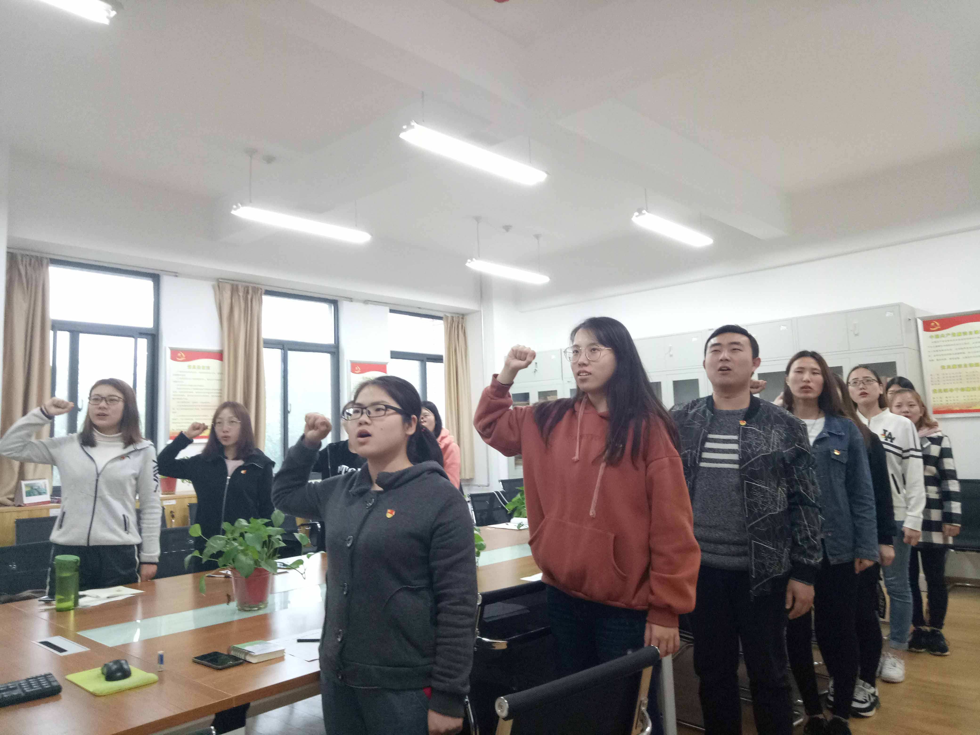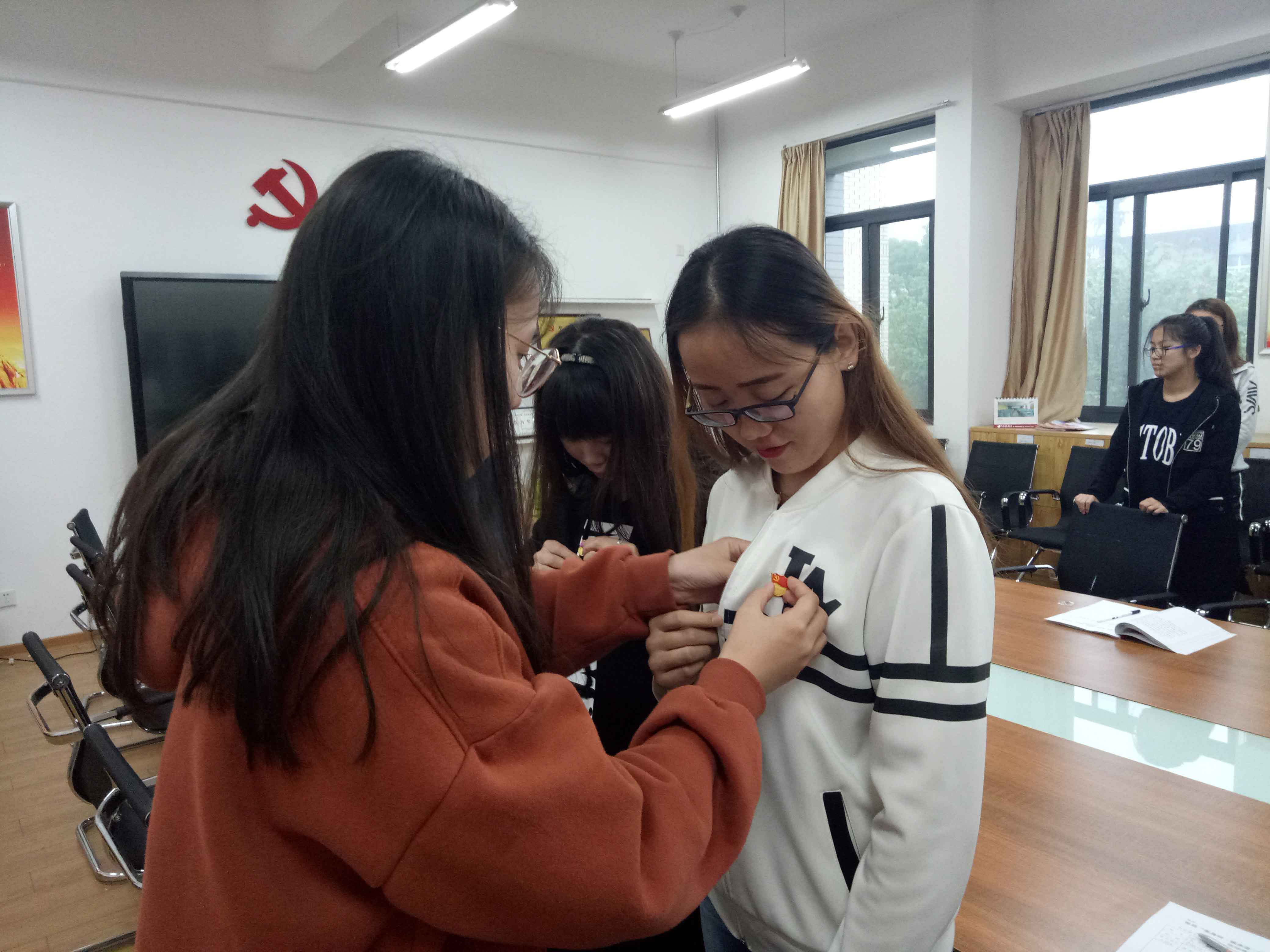 递交承诺书后,贺子婕书记给支部内党员一一佩戴党徽。党徽佩戴完毕后,支部成员全体起立,面向党徽,由贺子婕带领,庄严而认真的宣读入党誓词。