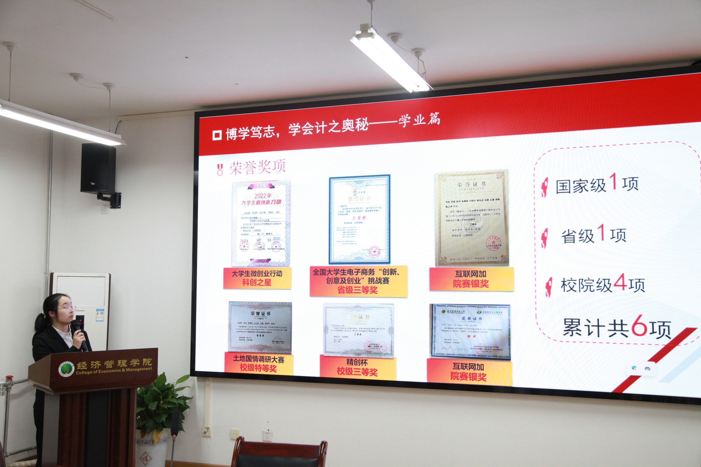 此次评选答辩展示分为个人陈述环节和评委提问环节,候选人们讲述了他们的老员工活:从加权成绩到奖项荣誉,从员工工作到社会实践,从享受生活到服务社会.....金融2102班的郭楠,23门课程中20门课程绩点满分,共获得了4项国家级荣誉,5项省级荣誉,19项校级荣誉,她还是一位热心服务的员工干部,担任校团委创新创业部副部长,班级班长及班主任助理,组织策划多场活动,她以兴农勇毅解民生为目标,争做青春助农实干家。