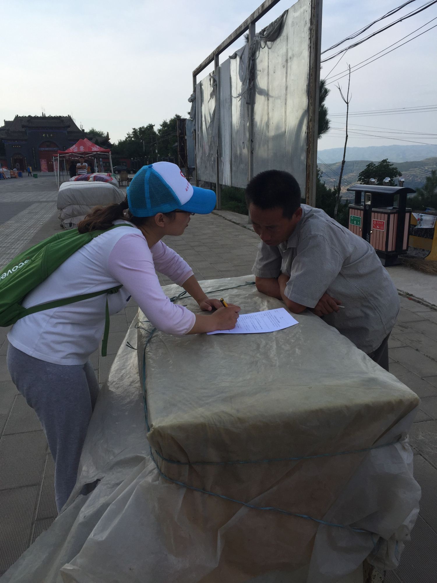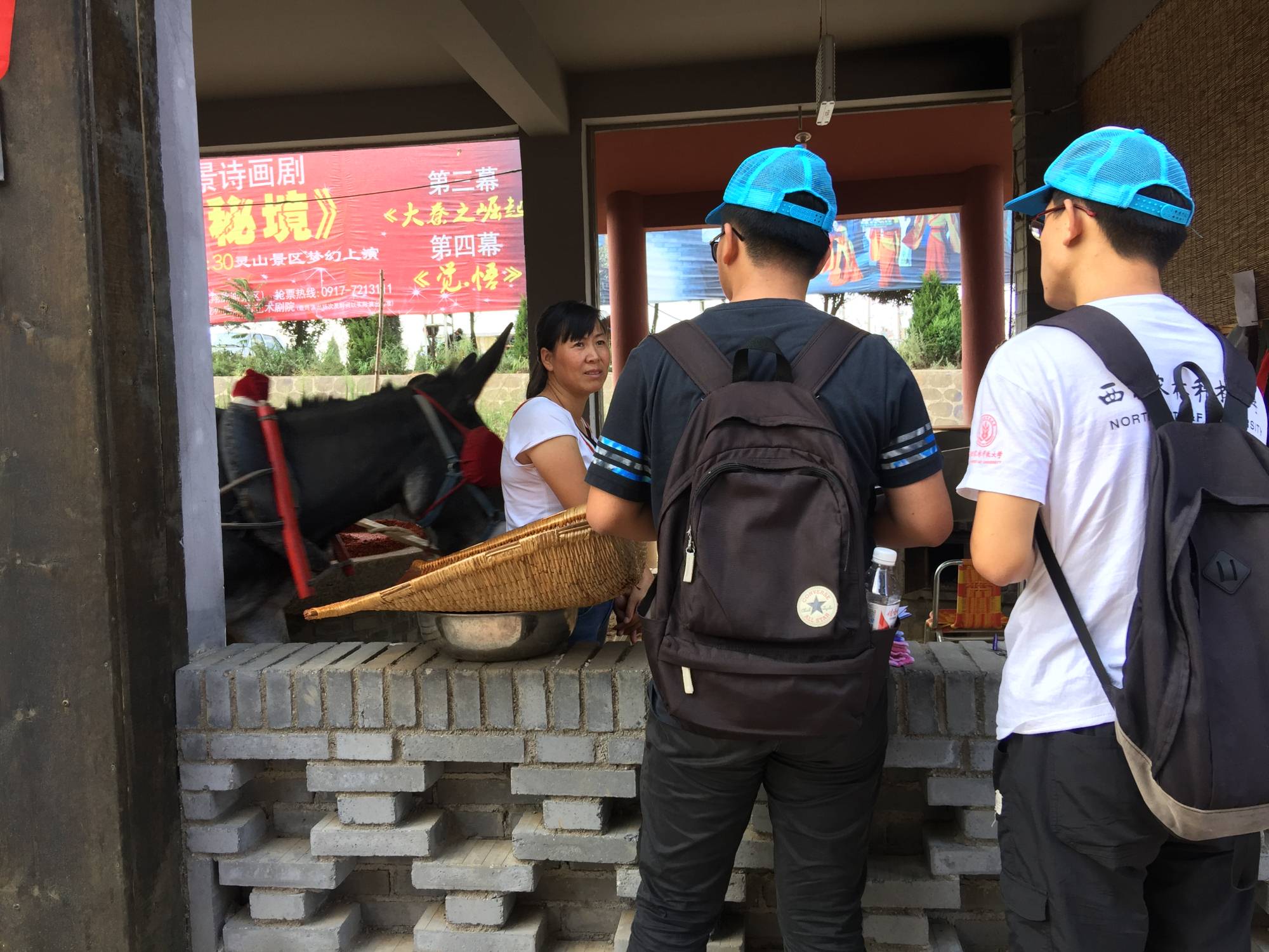 当日下午,调研团队决定去凤翔县柳林镇会山村进行调研,这里有着有名的灵山,灵山因为春秋时期秦穆公在此打猎遇见灵鹫鸟而闻名,久而久之有修建起了寺庙,现在以旅游业闻名,是西北少有的佛教圣地。会山村地处灵山附近,政府招商引资,在这里建设了仿古城镇,村子里许多人在这里打工或是开店,当中也有许多是返回家乡的农民工。调研团队到达后,化整为零,顶着炎炎烈日,从古镇入口开始调研。在调查中我们发现,虽然古镇建设已经初具规模,但是因为一些配套建筑还未完工,人流量并不是很多,而在这里开店创业的农民工对此看法也不尽相同,有的人认为前景不甚乐观,想另寻出路,也有人认为这里未来形势将会一片大好,愿意继续坚持。不管怎样,调研队员都希望他们能有一个美好的将来,会有属于自己的幸福。