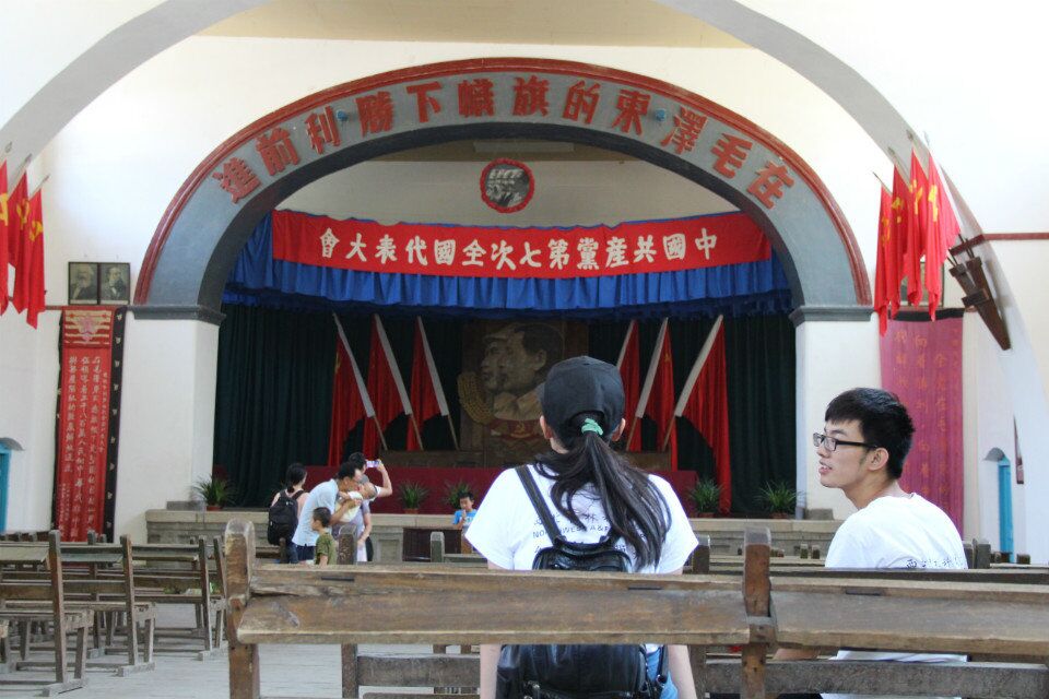 留给团队成员印象最深的无疑是中央大礼堂,走进中央大礼堂,里面的陈设仍然保持着66年前的风貌。主席台正中是毛泽东、朱德的巨幅画像;会场后面墙上,悬挂着“同心同德”4个大字;两侧墙上悬挂4幅“坚持真理”、“修正错误”标语;靠墙边插着24面红旗,象征着中国共产党24年奋斗的历程;插红旗的“V”字形木座是革命胜利的标志;在主席台的正上方,悬挂着一条引人注目的横幅:“在毛泽东的旗帜下胜利前进!”