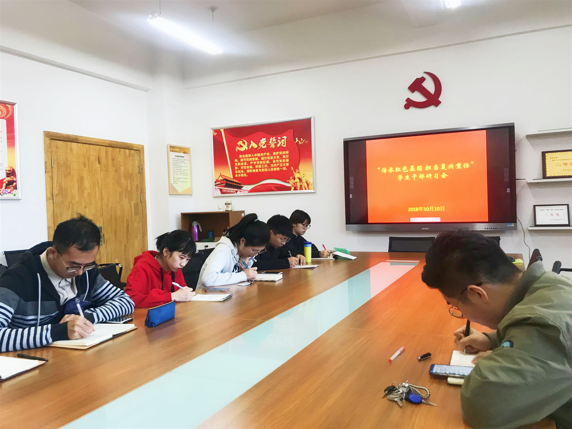 随后,辅导员张鹏飞带领主席团全体成员共同学习“传承红色基因,担当复兴重任”主题教育活动中要求的相关理论知识,领学了《关于在员工中开展“传承红色基因,担当复兴重任”主题教育》有关通知文件,阐述“红色基因”重大意义和科学内涵,并要求员工干部自觉坚定红色信仰,传承红色基因,践行红色精神。