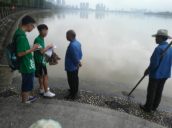 赴汉江流域环保实践服务队在一江两岸湿地公园集合完毕,队伍分工完成后正式展开调查工作和宣传活动。实践服务队沿着汉江河行进,途中对一江两岸管委会的垃圾船负责人及环卫负责人开展问卷调查活动。通过调查,实践服务队了解到汉江上游水面垃圾问题仍旧严峻,每天垃圾船所收垃圾可达1吨,且以生活垃圾为主。环卫负责人反映,汉江边绝大多数游客都会把垃圾扔在指定地点,但仍有少数人乱扔垃圾。由此可见汉江上游附近仍有部分居民和游客的环保意识淡薄并且对水污染后果及保护水资源的重要性不甚了解,汉江水资源保护的宣传工作仍需加强。
