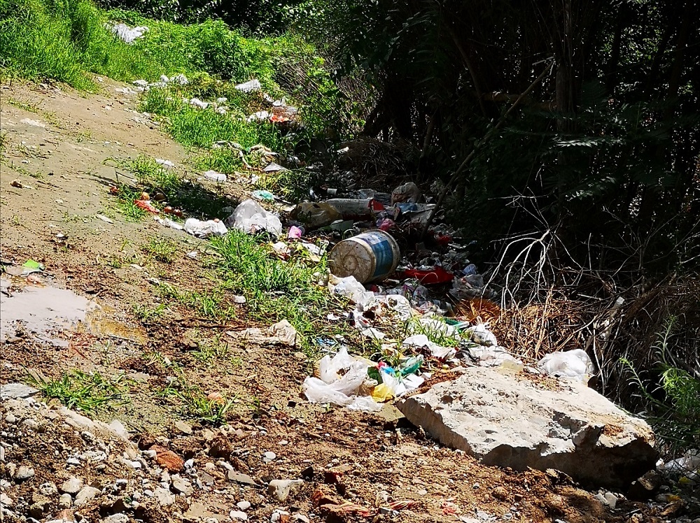 因修下水道导致的草丛中出现的生活垃圾