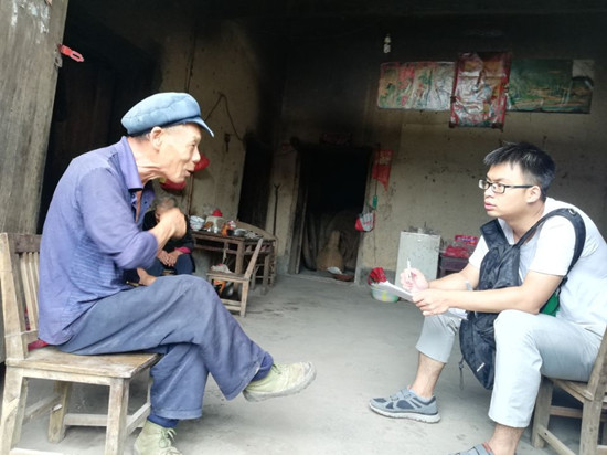 队员们继续沿着山路向上行进。突然,天上下起了淅淅沥沥的小雨,山路变得更加湿滑、更加泥泞行,走起来更加艰难,但这艰难得道路并没有打消队员们的热情。经过一段时间的行走之后,终于到达一户农民家中。和年长的农户交流后,队伍得知,老人家里有养老保险补贴和农村合作医疗,生活情况基本可以自理。老人年轻的时候从事高强度的劳动,落下了病根,年老后身体情况就不太好。队员们问到老人怎么看病时。老人有些无奈地说:“自己没有和儿子住在一起,只能给儿子打电话让他骑摩托车接自己下山去看病,这太不方便了”。