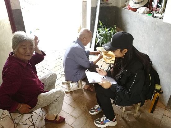 队伍首先抵达的是距离镇上十分相近的五泉村。在五泉村的调研过程中,队员们看到,路两旁都是整齐的园圃,有些农户家种植着蔬菜,有些种着花苗,令人心旷神怡。每相隔不远处就有崭新的垃圾桶,路上并无任何垃圾,只有黄澄澄的玉米粒在太阳下悠闲地晾晒着。队员们了解到,五泉村每条道路都有专门的清洁员工负责清扫,而这些清洁工都由村中的老人组成,有乡政府发放一定的工资,为村里老人减轻农活负担的同时还提供了一份可观的收入。在走访过程中,一位农户向队员吐露心声:“现在的村干部是真正干实事了,选举的时候也是我们村里的人一起投票的,完全不是过去村里个别人决定的,公平、公正的很。”