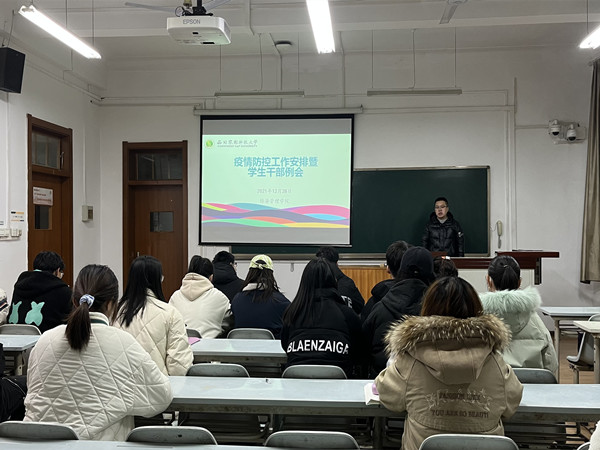 12月28日晚,2021级在北校区三号教学楼召开疫情防控工作安排会暨员工干部例会,2021级辅导员吴龙刚、常小文及各班班长、支书参加会议。
