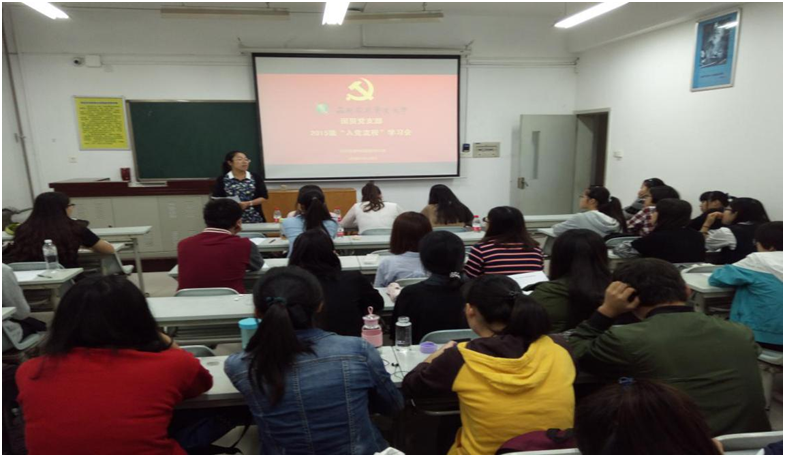 董春柳老师首先对活动进行了简要说明,国贸支部张永基同志就党员发展工作的指导原则、党员发展的工作程序以及党员发展工作中应注意的事项等内容做了讲解,并结合自身入党经历详细介绍了入党积极分子的确定与培养教育和考察、发展对象的确定和考察、预备党员的接收以及预备党员的教育考察和转正等四个阶段的具体工作与内容。